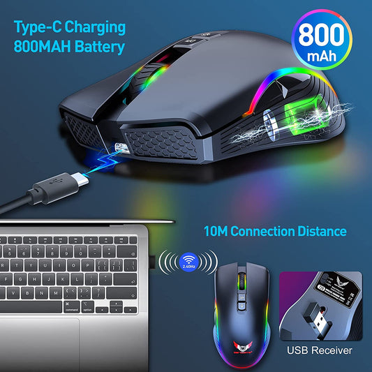 Rechargeable Wireless Gaming Mouse, RGB LED Backlit Mouse with 4 Adjustable DPI, 7 Button, 2.4G USB Optical Gaming Ergonomic Computer Mice for Laptop PC Gamer Computer Desktop (Black)