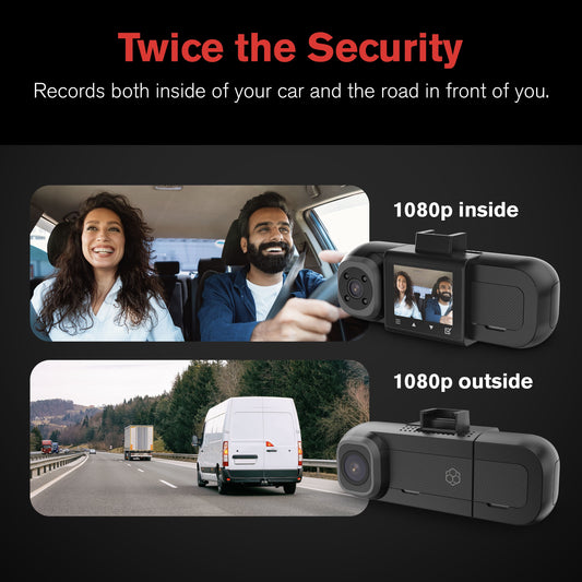 Roadcam Dual Two-Way Recording Dash Cam with 1080P Front and Interior Cabin View, Smart G-Sensor, Wi-Fi App Compatible, 16GB SD Card Included. BT532698